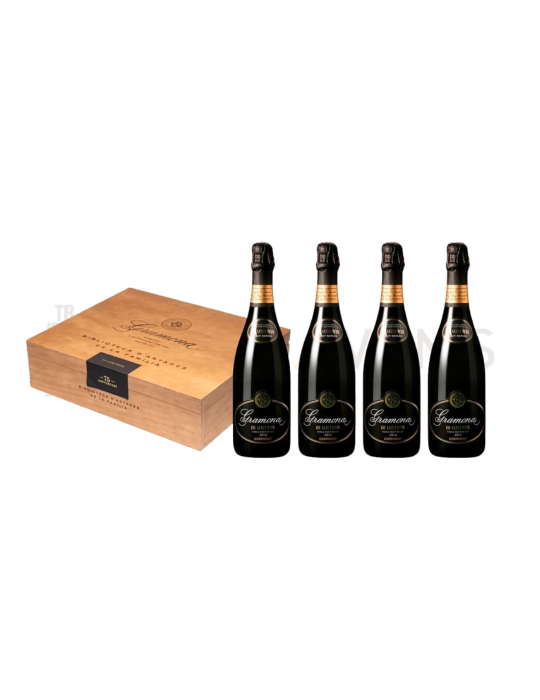 Contendido del pack: Caja madera + 4 botellas Gramona III Lustros de diferentes añadas